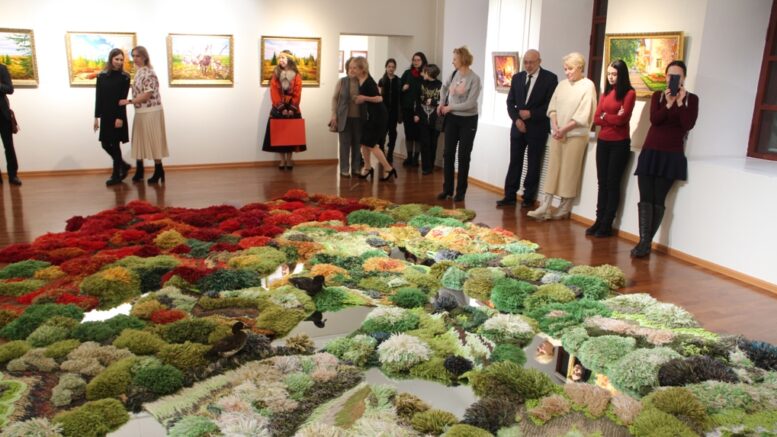 Центром выставки стало уникальное произведение декоративно-прикладного искусства – гобелен ручной работы «Тундра». Его площадь 25 квадратных метров. Ковер-гобелен горизонтальный и лежит на полу как яркий фрагмент тундрового болота. На нем сидят чучела уток, сверкают зеркала воды. Посетители с интересом фотографировались на фоне этого рукотворного чуда и трогали мягкий мох по краям. Гобелен выполнен в технике авторского коврового плетения, создающего текстильный ландшафт, по заказу Ненецкого автономного округа в 2014 году петербургской художницей Еленой Ткаченко. Чтобы увидеть особенности цветового спектра арктических мхов, трав, лишайников тундры, она несколько раз приезжала в НАО. Гобелен состоит из трех частей: «Весна», «Лето» и «Осень». Вместе это двадцать мобильных текстильных пазлов.