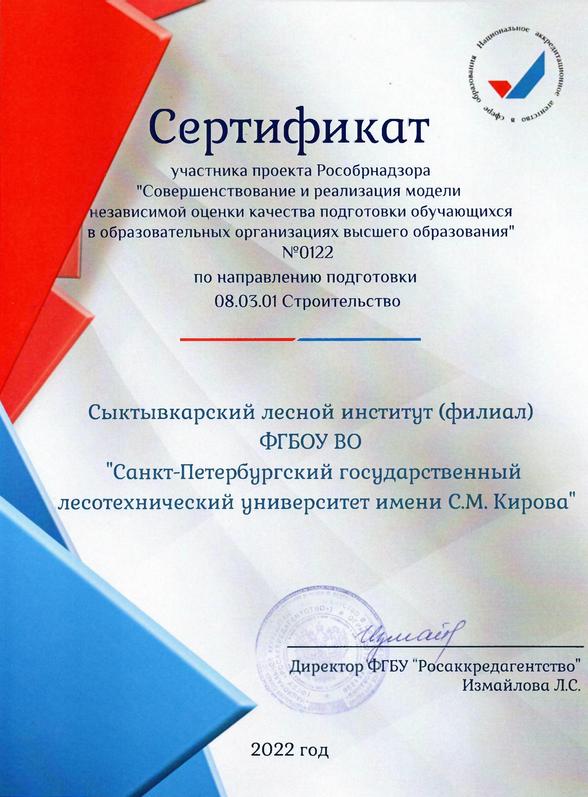 Независимая оценка качества образования (НОКО) была осуществлена для группы четвертого курса направления подготовки «Строительство» еще в конце прошлого года, а уже в начале января 2023-го Сыктывкарский лесной институт получил сертификат участника проекта Рособрнадзора за подписью директора «Национального аккредитационного агентства в сфере образования» Лемки Измайловой.