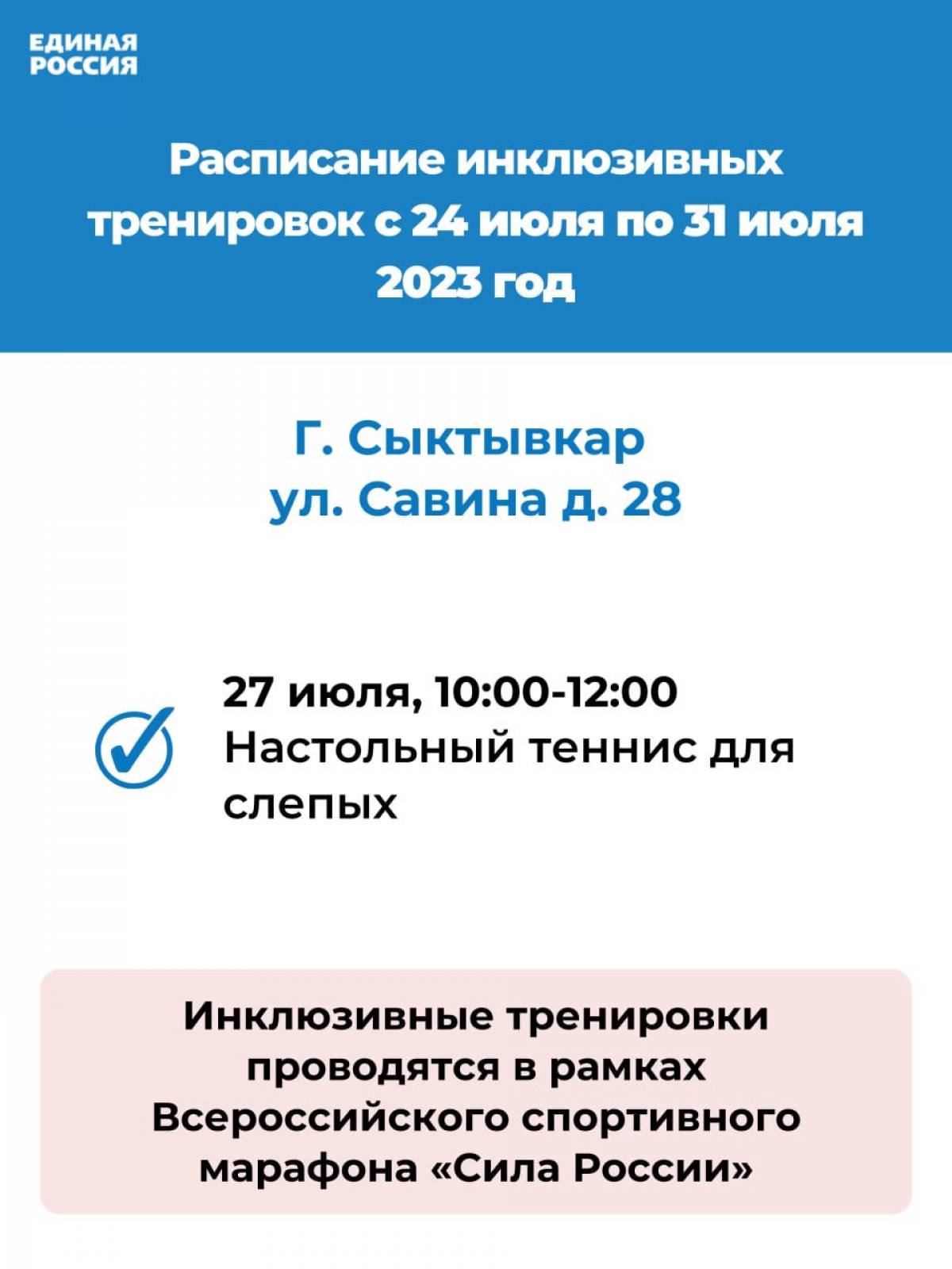 В рамках Всероссийского марафона «Сила России», организованного сторонниками партии «Единая Россия», с 24 по 30 июля в Республике Коми пройдет неделя инклюзивного спорта для людей, имеющих инвалидность.