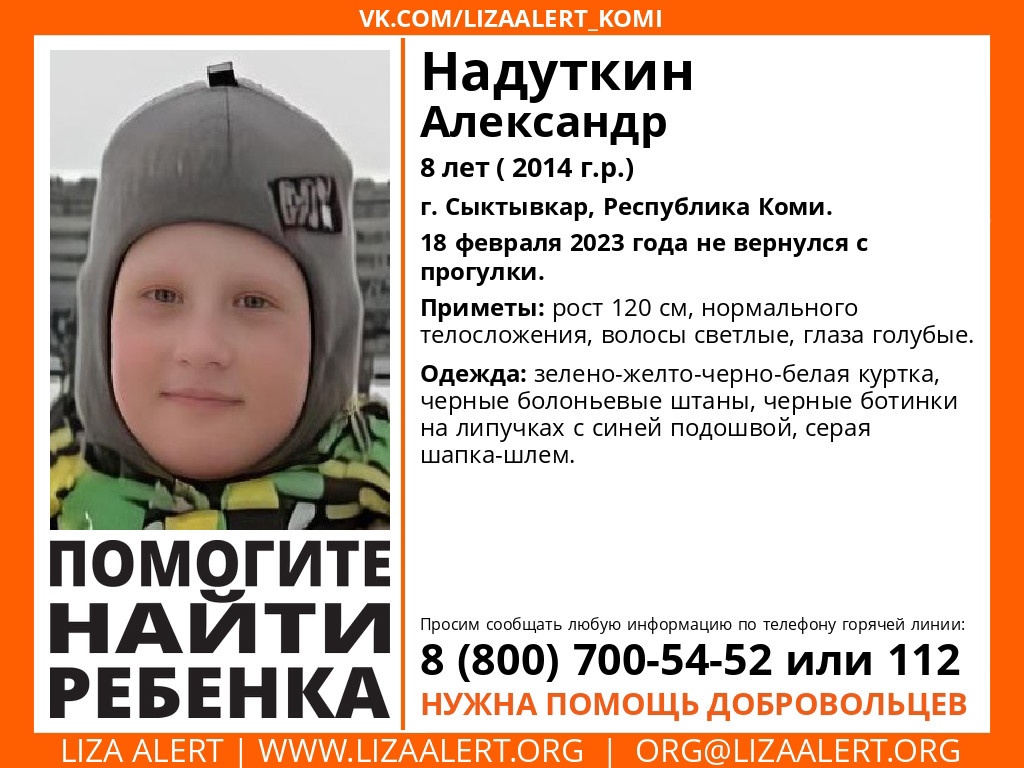 В Сыктывкаре волонтеры "Лиза Алерт в Коми" организовали поиски 8-летнего Александра Надуткина.