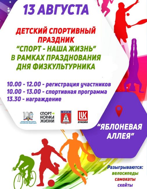 Напомним, что сегодня, 13 августа, на Яблоневой аллее состоится спортивный праздник для детей. Приглашаем маленьких ухтинцев и их родителей с пользой провести время!