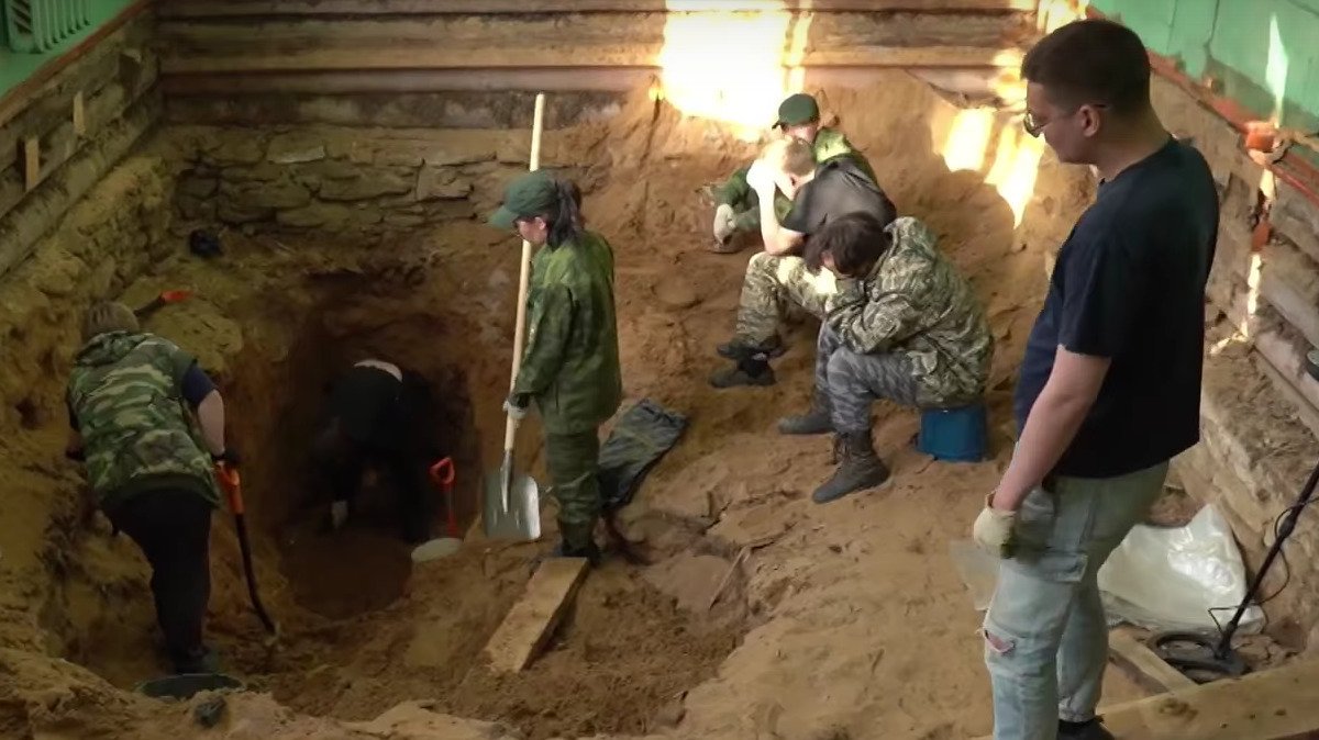 В помещении, где раньше располагалась библиотека, вскрыли полы, провели разведку с помощью щупа и металлоискателя — священнослужителя похоронили в полном облачении, в том числе при нем был крест. После сняли большой слой песка, который привезли для постройки здания.